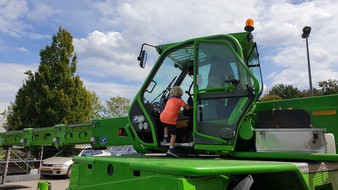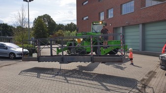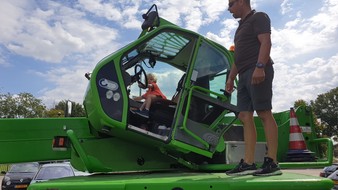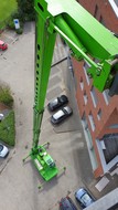 Toen het eindelijk tijd was een beladen autorit naar Veghel. Vanaf de snelweg zag Aeron de hoogwerker al staan (kon helemaal niet đ) en was ook vrij zeker dat hij zag dat ome Hans een beetje kaas aan het eten was. Bij het gebouw aangekomen stond het groene gevaarte op ons te wachten met Hans erin.