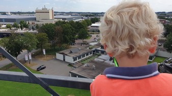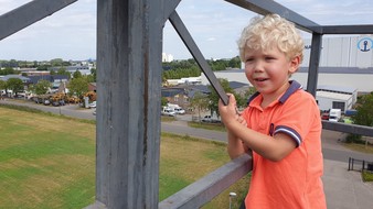 We gingen vrijwel meteen omhoog en bovenin mocht Aeron even bellen met tante Yasmin die het ook wel spannend vond. We staken ruim boven een gebouw van zeven verdiepingen uit, dus ik vond het naast imposant, ook eigenlijk wel ver genoeg. Van Aeron mochten we echter echt nog wel verder. We hebben een tijdje rondgekeken voor we weer naar beneden gingen.